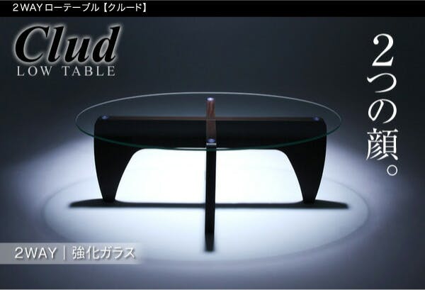 2つの顔。 2WAYローテーブル 【Clud】クルードDesign…違いを楽しむ2WAYFunction…安心の強化ガラスConstruction…嬉しい簡単組み立て●天板と木脚のデザインを楽しむ。オーバルデザインのガラス天板と直線と曲線からできた木脚。しっかりとした幅のあるデザインが、テーブルの存在感を示します。