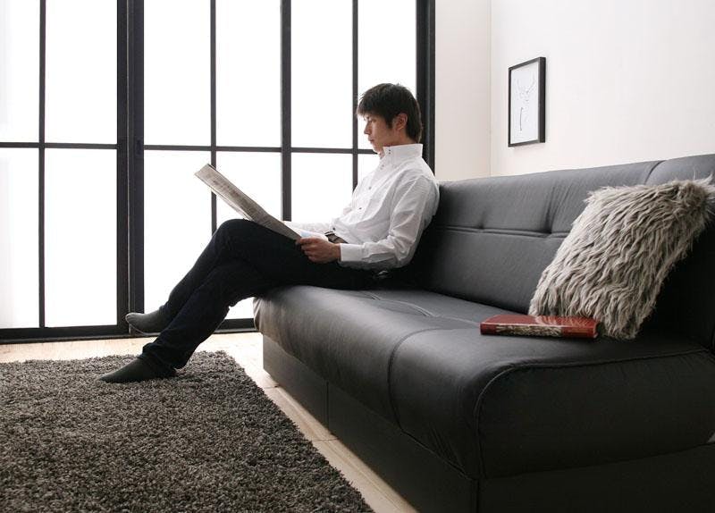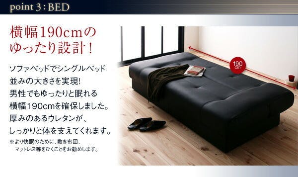 ソファがベッドになるだけではありません!背もたれは好きな角度で調整がOK。日常ソファとしてしっかり座る、リクライニングをつけてゆったり座る。くつろぎ方次第で、ソファも変わる!自分だけのお気に入りの角度を見つけて下さい。point03:横幅190cmのゆったり設計ソファベッドでシングルベッドなみの大きさを実現!男性でもゆったりと眠れるように、横幅190cmを確保しました。仮の寝床であっても、眠るならぐっすり眠りたいですよね。