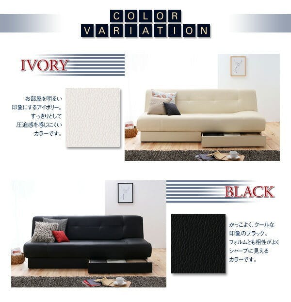 point05:日本製!国際規格認証の品質信頼の日本製で、製造は国際規格のISO9001認証取得工場で行っています。骨組や縫製の仕上げなど、しっかりとしたつくりです。中国製品が多いなか、安心の品質基準です。Color variationアイボリー・・・お部屋を明るい印象にするアイボリー。すっきりとして圧迫感を感じにくいカラーです。ブラック・・・かっこよく、クールな印象のブラック。フォルムとも相性がよくシャープに見えるカラーです。