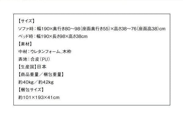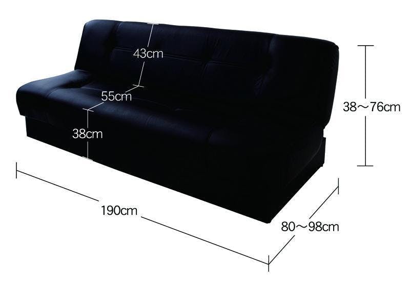 ソファ時:幅190×奥行き80~98(座面奥行き55)×高さ38~76(座面高38)cm、ベッド時:幅190×長さ98×高さ38cm