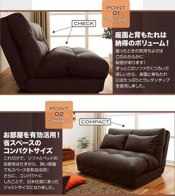 ■座面と背もたれは納得のボリューム!座ったときの気持ちよさはこのふかふかに秘密があります!ずっとこのソファでくつろいでほしいから、座面と背もたれにはたっぷりとウレタンチップを使用しました。 ■お部屋を有効活用!省スペースのコンパクトサイズこれだけで、ソファとベッドの役割をはたすから、狭い部屋でもスペースを有効活用!さらに、コンパクトにしたことで、日本住居にあったジャストサイズになりました。