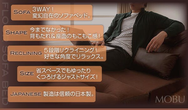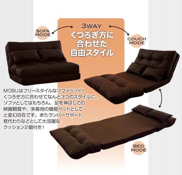 コンパクトでも3通りの使い方! フロアソファベッド【MOBU】モブ ■くつろぎ方に合わせた自由スタイルMOBUはフリースタイルなソファベッド!くつろぎ方に合わせてなんと3つのスタイルに。ソファとしてはもちろん、足を伸ばしての映画観賞や、来客時の簡易ベッドとして・・・と変幻自在です。またランバーサポート、枕代わりなどとして大活躍なクッション2個付き!