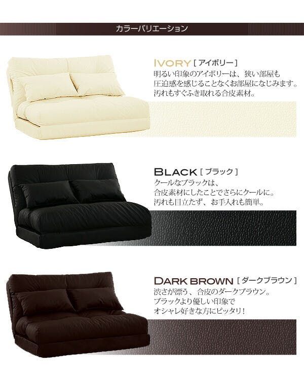 ■カラーバリエーションアイボリー・・・明るい印象のアイボリーは、狭い部屋も圧迫感を感じることなくお部屋になじみます。汚れもすぐふき取れる合皮素材。ダークブラウン・・・渋さが漂う、合皮のダークブラウン。ブラックより優しい印象でオシャレ好きな方にピッタリ!ブラック・・・クールなブラックは、合皮素材にしたことでさらにクールに。汚れも目立たず、お手入れも簡単。