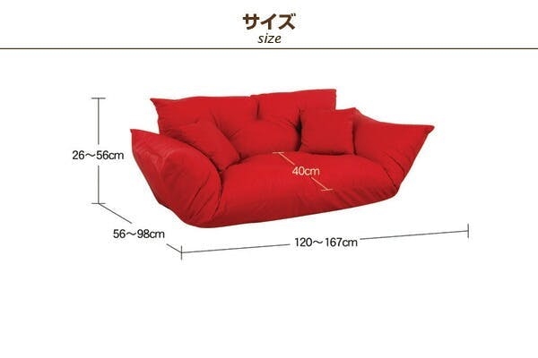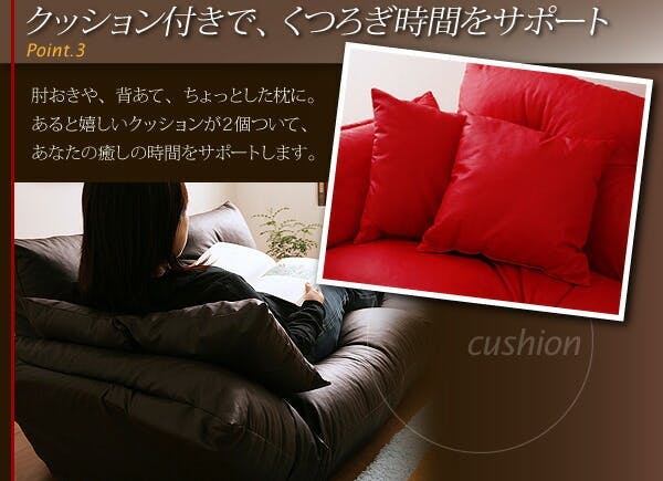 ■クッション付きで、くつろぎ時間をサポート肘おきや、背あて、ちょっとした枕に。あると嬉しいクッションが2個ついて、あなたの癒しの時間をサポートします。 ■信頼度NO1の日本製フレームの加工から、側地の縫製、組み立てまですべて日本で行っています。信頼できる国産だからこそ、自信をもっておススメできる商品です。
