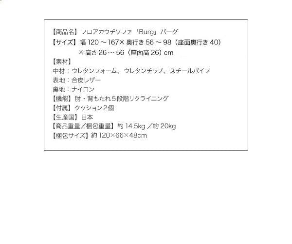1人暮らしに大人気! フロアカウチソファ【Burg】バーグ ■見たことない!このボリューム感!こんなふかふかしたソファ、今まで見たことありますか?見た目と座り心地を考えて、この厚みになりました。ウレタンチップを惜しげもなく使ったこの座り心地、やみつき! ■肘・背もたれは5段階リクライニング!好きな姿勢でくつろげるよう、肘と背もたれは5段階のリクライニング仕様。その時の気分に合わせて、自由なくつろぎスタイルを満喫。