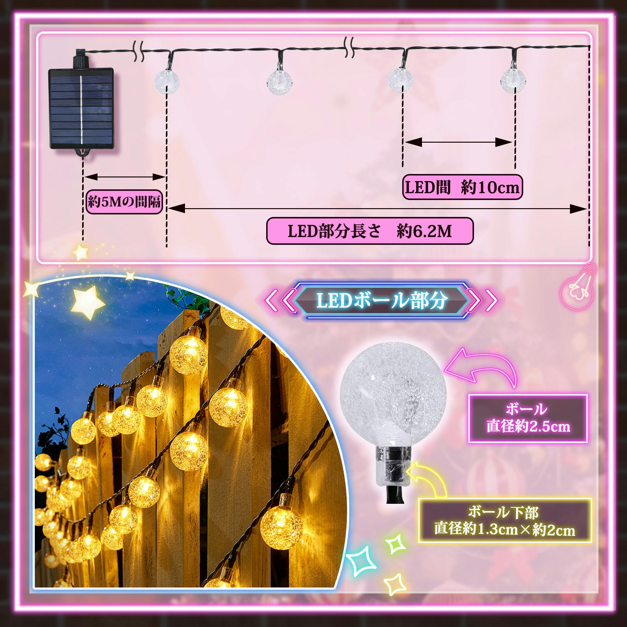 KOZUMUWAN ソーラー イルミネーション 6.2m 62球 LED バブル ボール ストレート 防水 8モード 自動点灯 クリスマス ハロウィン パーティー バレンタインデー 新年 祝日 結婚式 誕生日 学園祭 屋外 室内 庭 ソーラーパネル 飾り 防雨 装飾ライト (グリーン)