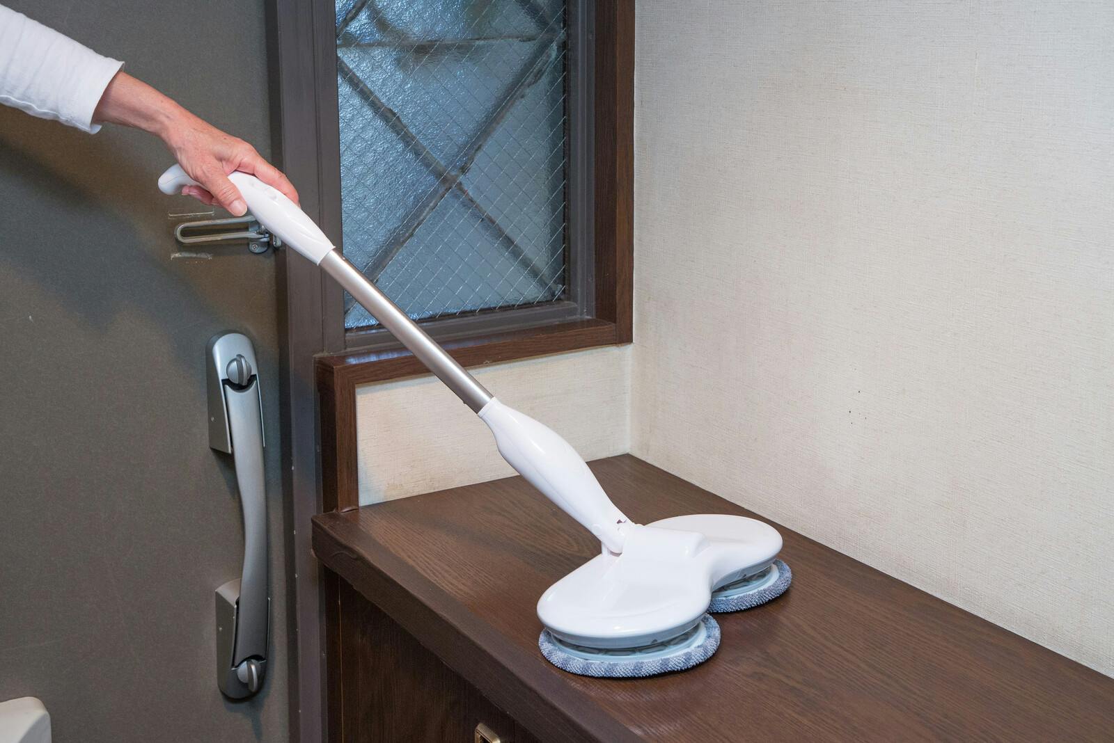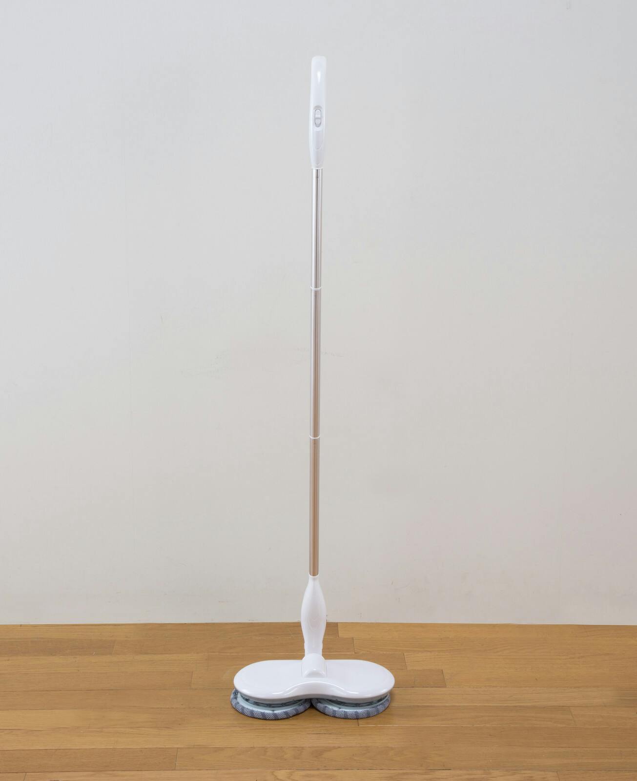 立ったまま拭き掃除ができるからお掃除がラクラク。 ●一分間に約200回転、高速回転で素早く汚れを落とします。 ●モップ掛けで汚れも簡単に落とし99%の除菌ができます。 ●先端にLEDライト付き、暗い場所でも汚れが見えて掃除ができます。 ●延長ポールを利用して最長120cm、窓の高い位置もしっかり届きます。また、延長ポールを外せばハンディ仕様に2段階調節可能。