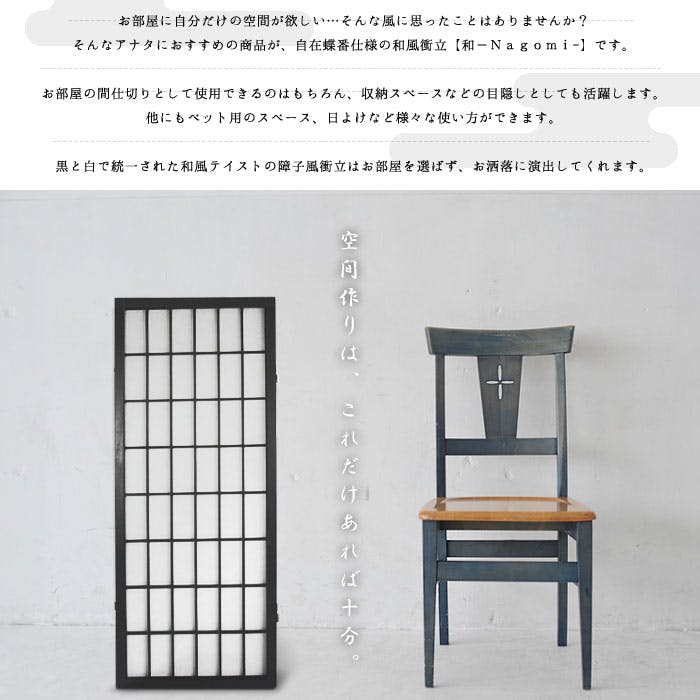 お部屋に自分だけの特別なスペースが欲しい…。そんなあなたにおすすめの商品が、こちらの和風衝立。お部屋の間仕切りとしてはもちろん、急な来客など見られたくない場所の目隠しとしても活躍します。和紙のような丈夫で破れにくい不織布を採用。強い光を柔らかく遮ります。また、自由蝶番を使用しているので、使わないときはコンパクトに折り畳みできます。お部屋の空間づくりに、ぜひご検討ください。 ※新品アウトレット