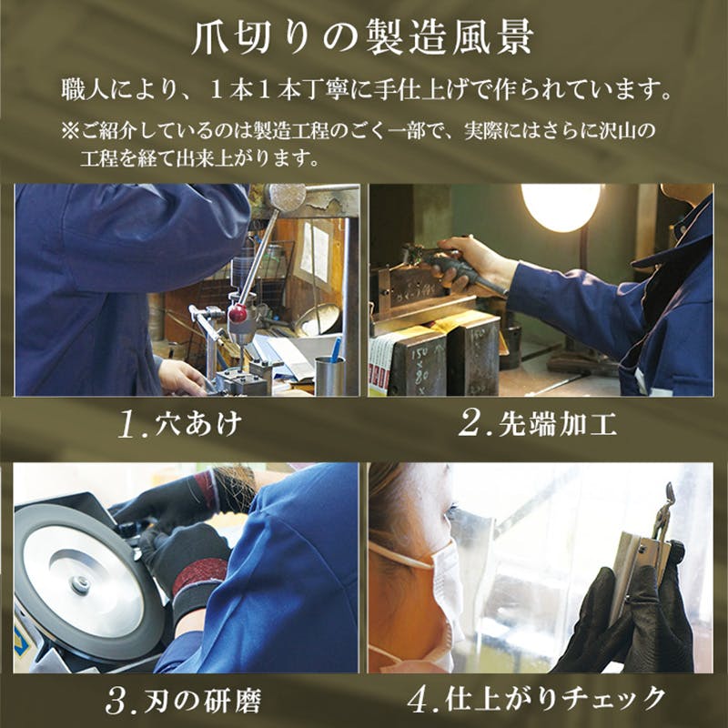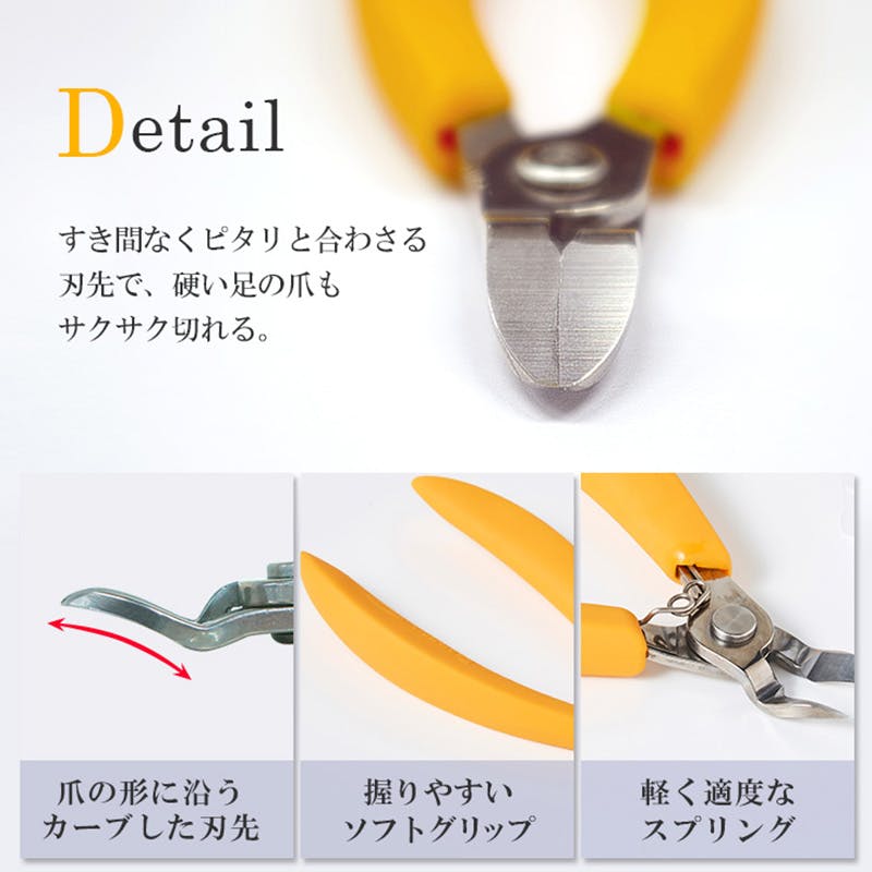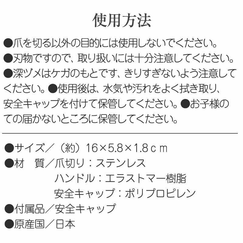 【使用上の注意】 ●爪を切る以外の目的には使用しないでください。 ●刃物ですので、取り扱いには十分注意してください。 ●深ヅメはケガのもとです。切りすぎないよう注意してください。 ●使用後は、水気や汚れを良く拭き取り、安全キャップを付けて保管してください。 ●お子様の手の届かないところに保管してください。