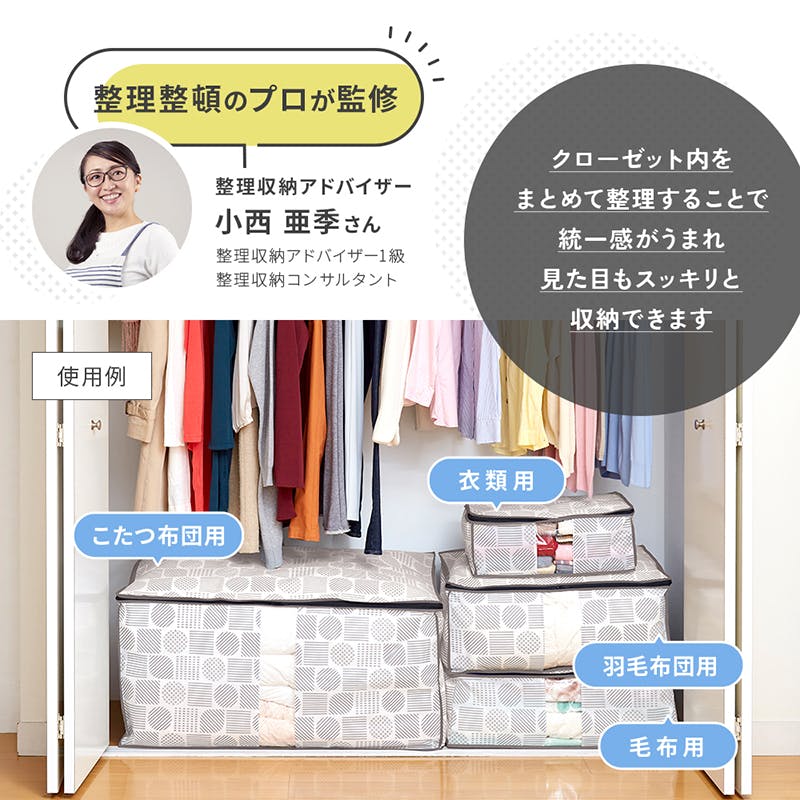 に物を乗せた状態で収納袋を引き出さないでください。 ●洗濯やアイロンはお避けください。 ●火気付近で使用しないでください。 ●用途以外には使用しないでください。 ●開封時に材質特有の臭いがします。気になる方は風通しのよい場所で陰干ししてください。 ●布団・こたつ布団の厚みや大きさにより入らない場合があります。