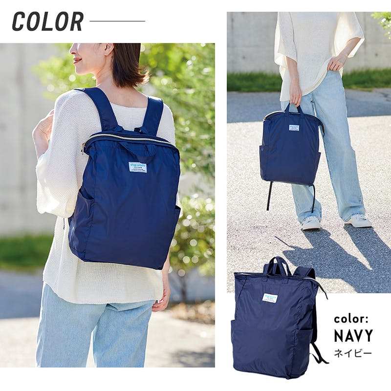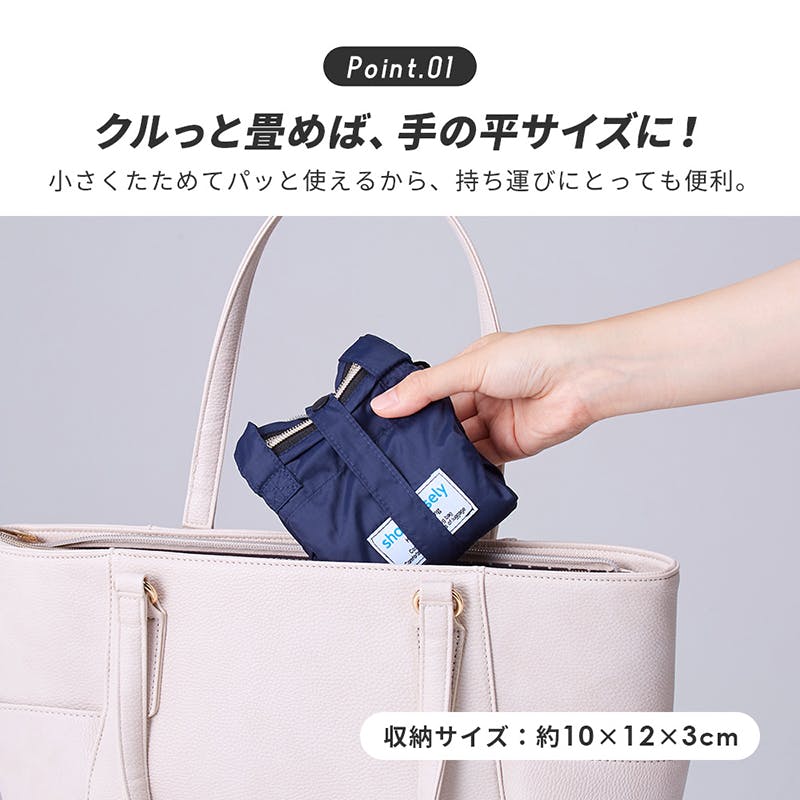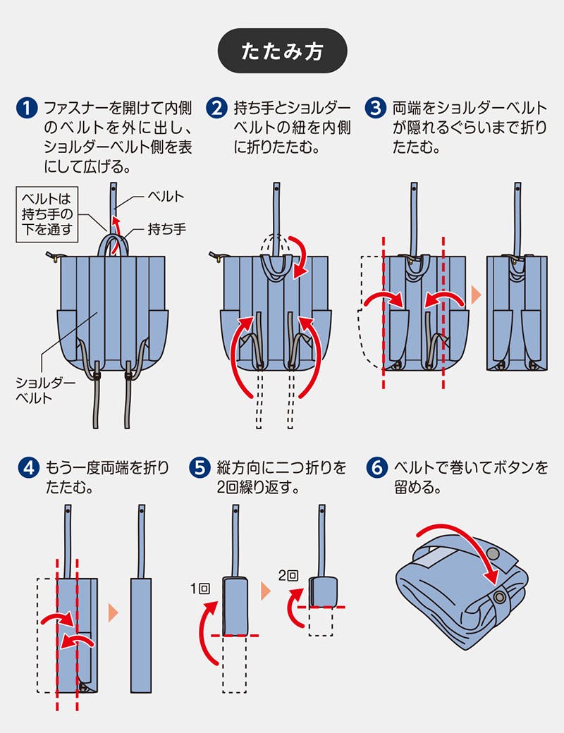 1. ファスナーを開けて内側のベルトを外に出し、ショルダーベルト側を表にして広げる。 2. 持ち手とショルダーベルトの紐を内側に折りたたむ。 3. 両端をショルダーベルトが隠れるぐらいまで折りたたむ。 4. もう一度両端を折りたたむ。 5. 縦方向に二つ折りを2回繰り返す。 6. ベルトで巻いてボタンを留める。 ※汚れた場合は、水を浸してよく絞った布などで拭き取ってください。(洗濯できません