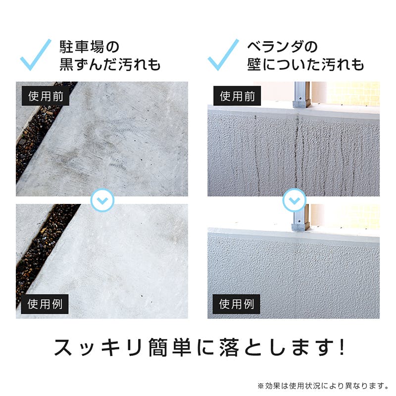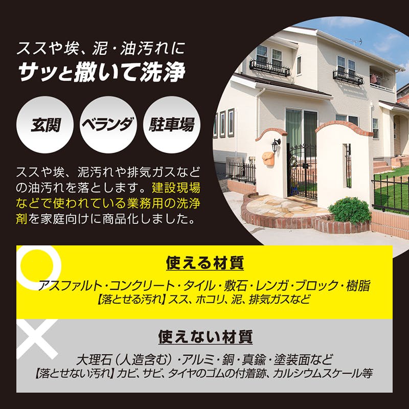 液性:弱アルカリ性 用途:使える材質/アスファルト、コンクリート、タイル、敷石、レンガ、ブロック、樹皮 使えない材質/大理石(人造含む)、アルミ、銅、真鍮、塗装面など 落とせる汚れ/スス(煤)、ホコリ、泥、排気ガスなど 落とせない汚れ/カビ、サビ、タイヤのゴムが付着した跡、カルシウムスケールなど 使用量目安:1㎡あたり20mL ※目に入らないよう注意し、炊事用手袋着用の上ご使用ください。 1.ゴミをほうきなどで取り除く。 2.シミなどの防止のため、水を撒く。