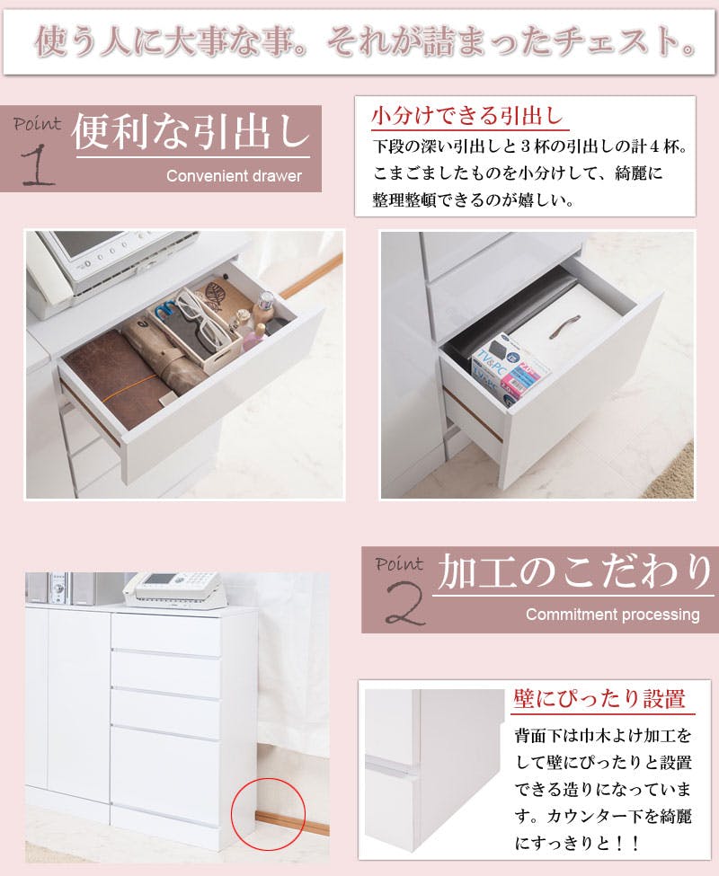 前板・天板:ハイグロス化粧繊維板、その他:プリント紙化粧繊維板(傷に強い樹脂コート加工)