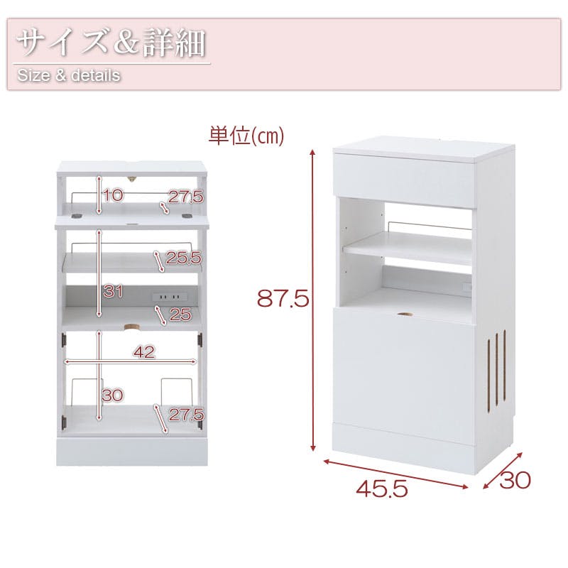 ■商品サイズ:(約)幅45.5×奥行30×高さ87.5cm、フラップ扉内寸:(約)幅42×奥行27.5×高さ10cm、オープン部内寸:(約)幅42×奥行25×高さ31cm、取り外し可能扉内寸:(約)幅42×奥行27.5×高さ30cm■付属品/コンセント(2口・合計1500W、コード長さ本体より約175cm)付き■耐荷重量/天板:(約)10kg、棚板:(約)5kgお客様組立品