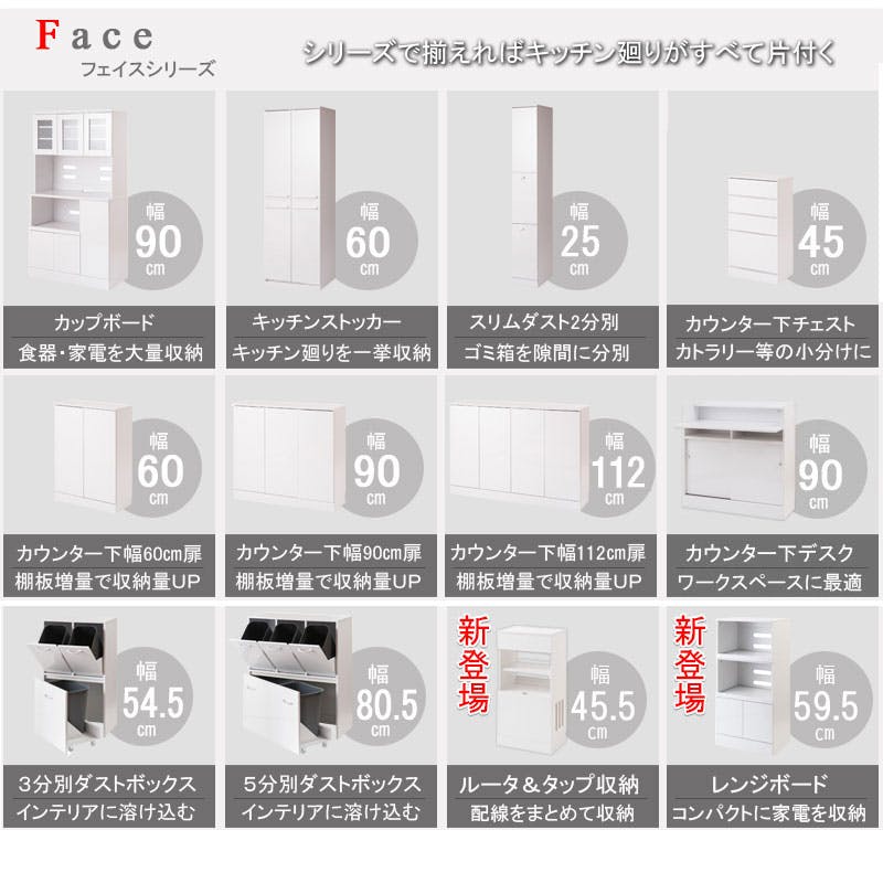 【face】キッチンシリーズ。家電製品からキッチンアイテムをしっかり収納できるコンパクトなサイズのレンジ台です。扉内は、移動できる棚板があるので、収納物に合わせて棚板を移動できます。棚板を外すとペットボトルを収納できる高さになります。上下段ともにスライド棚があり、手前に約25cmスライドするので炊飯ジャーやポットの湯気などを逃がしてくれるので大変便利です。レンジ台では、2口コンセントが1つしかついていないものが多ですが、お客様のお声にお応えして上下とも2箇所にコンセントをつけました。