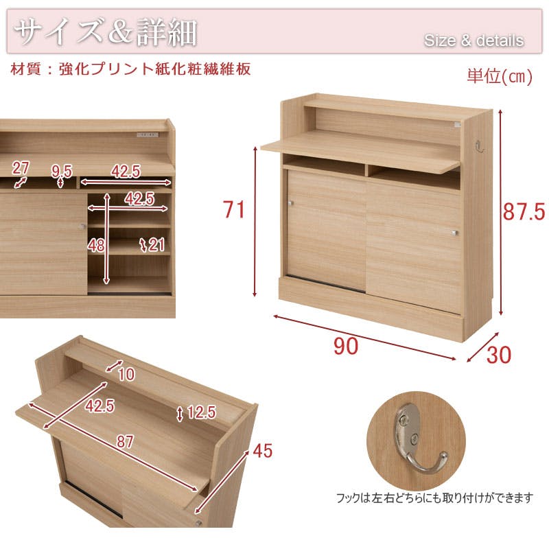 本体:(約)幅90×奥行(本体30・デスク面部45)×高さ87.5cm、デスク面/(約)幅87×奥行42.5cm■デスク下オープン部内寸(左右共通)/(約)幅42.5×奥行27×高さ9.5cm(左右共通)/(約)幅42.5×奥行21×高さ48cm