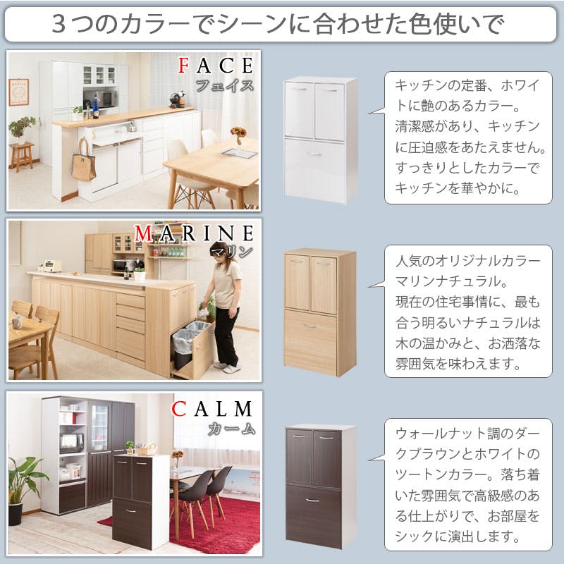 上品な木目が大人気。キッチンや、カウンター下の収納としてリニューアルされた【MARINE】マリンシリーズ。鮮やかなナチュラルカラーは、綺麗な木目が北欧テイスト感を醸し出しています。リビング・キッチンなどお部屋がさわやかな木の温かみを感じられる空間に。幅54.5cmのスリムな3分別。一人暮らしなどのワンルームには3分別が便利。