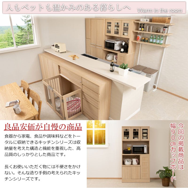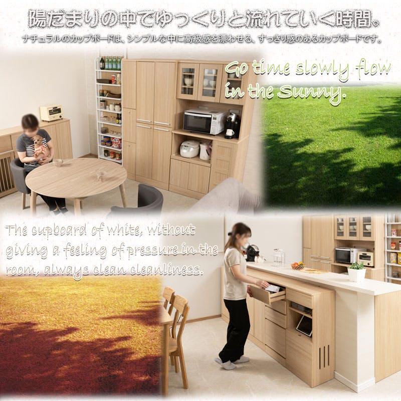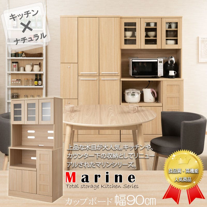 キッチンシリーズ Marine カップボード 幅90cm 高さ179.5cm マリンナチュラル 食器棚 キッチン収納 北欧 スライド レンジ台 レンジボード コンセント付 大容量 キッチンラック レンジラック 台所 おしゃれ ダイニングボード