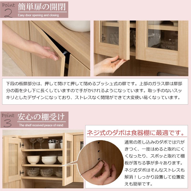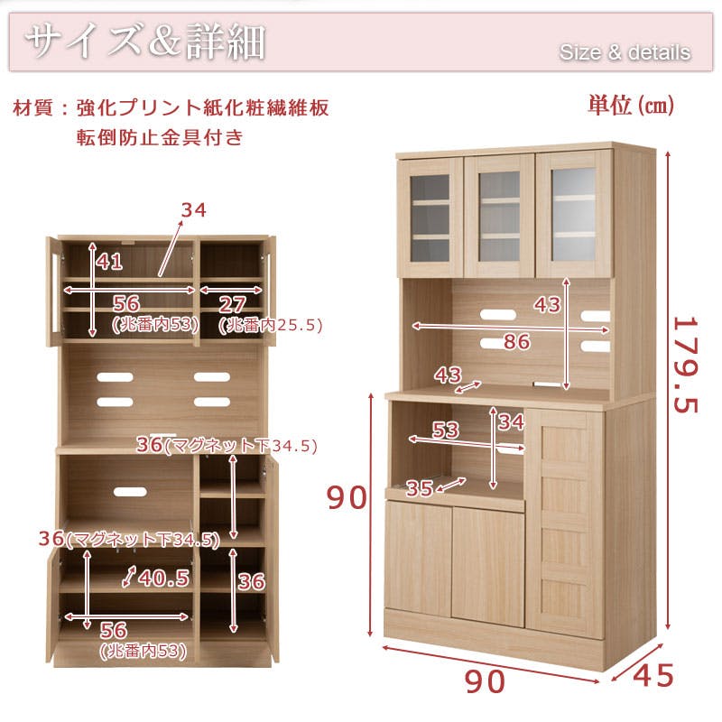 ■扉内寸/(上段)(約)幅(左)56(右)27×奥行34×高さ41cm(下段):(約)幅(左)56(右)27×奥行40.5×高さ(左)36(右)36(固定棚挟み上下共通)cm■オープン部内寸:(約)幅86×奥行43×高さ43cm■スライド棚内寸/(約)幅53×奥行35×高さ34cm■棚板/固定式(右下扉内):1枚、可動式:上部(大小)各2枚(3.2cmピッチ・6段階)、下部(大)1枚(3.2cmピッチ・5段階)下部(小)2枚(3.2cmピッチ・5段階×2)■商品重量/(約)57kg■お客様組立品