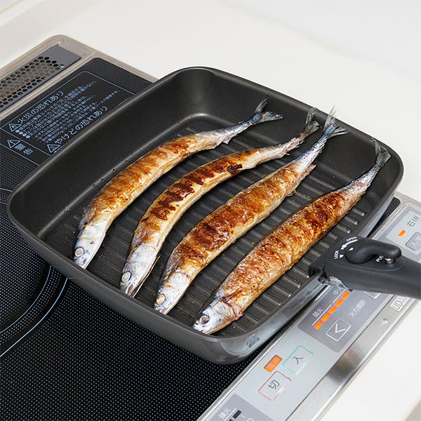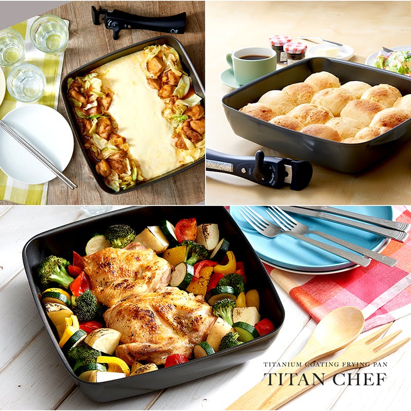 【チタンシェフ脱着ハンドル式フライパン スクエアパン 26cm】 ちあふる 取っ手が外せてホットプレートとしても使える1つで2役のグリルパン。ワイドサイズで秋刀魚もそのまま焼ける!耐摩耗性テスト200万回クリア IH・ガス対応 正方形 JAN:4989409101166