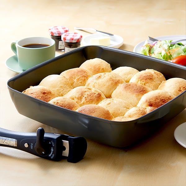 【使用前確認】 ※はじめて使用する際は食器用洗剤などでよく洗い少量の油でスクエアパンを熱して使用して下さい ※使用前には各部に亀裂・破損・へこみ・曲がり・接続部の緩みなどの異常がないことを確認して下さい。 異常がある場合は使用を中止して下さい。 【ハンドルの脱着方法】 <取り付け方> ※取り外し方の手順に従い、ハンドル先端を開いて下さい。1.ハンドル先端を開いてスクエアパンの縁の中央にハンドルを置きます。 2.ロックレバーを反時計回りに90°回し固定。 3.固定されているのを確認し、取り