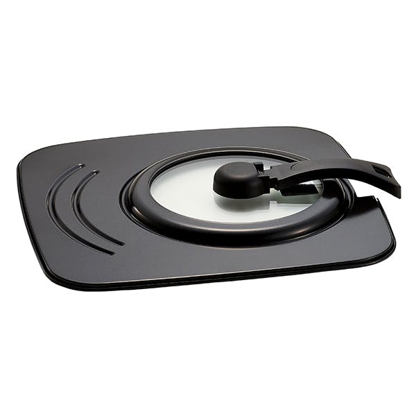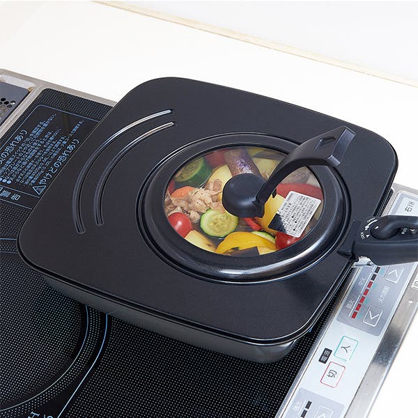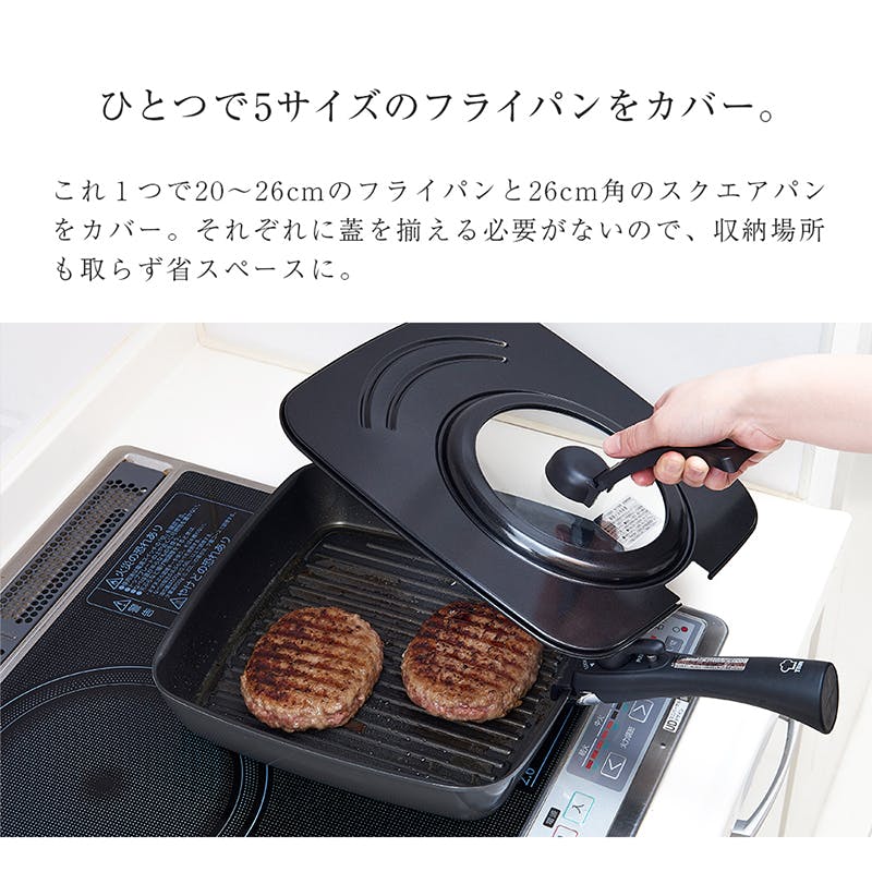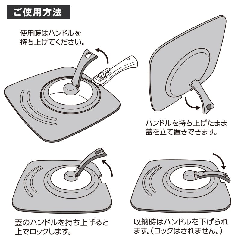 【使用前確認】 ●はじめて使用する際は、食器用中性洗剤で洗い、十分に乾燥させてから使用して下さい。 ●使用時はハンドルの持ち手を上に引き上げ、ロックした状態で使用して下さい。 ●フライパンサイズに位置を合わせて使用して下さい。 【使用方法】1.使用時はハンドルを持ち上げて下さい。 2.蓋のハンドルを持ち上げると上でロックします。 3.ハンドルを持ち上げたまま蓋を立て置きできます。 4.収納時はハンドルを下げられます。(ロックはされません。) 【お手入れ方法】 ●使用後は柔らかいスポンジ等に中性