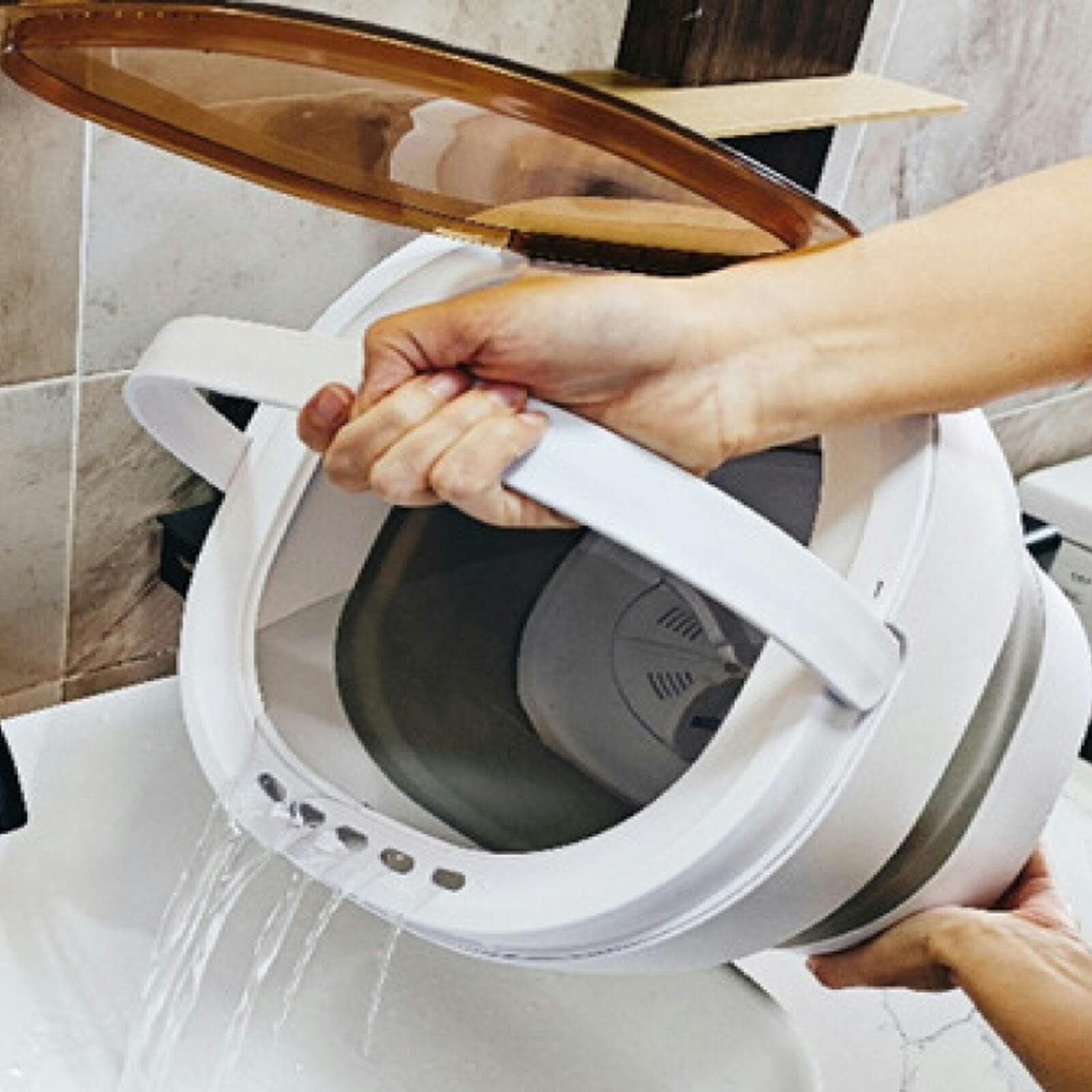 万が一の備えに!持ち運びが可能な折りたたみ式洗濯機 ●パワフルな水流でしっかり洗える! ●洗濯量目安/Tシャツ:約1枚、靴下:約5足、タオル:約2枚、ペット服:約1枚 ●選べるコース時間/2分・5分・10分 ●洗濯後は上部の排水口から排水可能 ●場所を取らずに収納できる! ●色柄物の洗い分けにも ●水量約7L ●軽量約1.5kg [仕様] ●電源:AC100-240V(50/60Hz) DC12V/2A ●定格消費電力:18W ●使用水量:7L