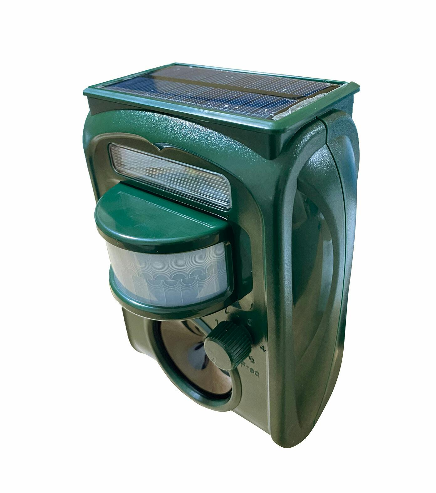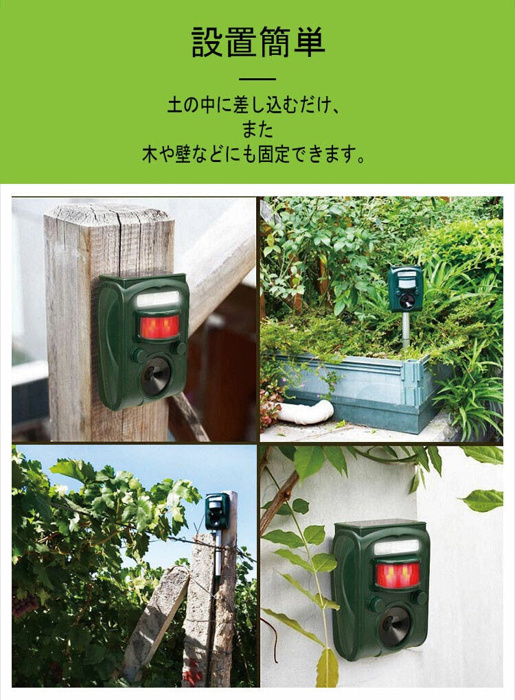超音波と光と音で害獣や害鳥を寄せつけない! ●色/グリーン ●対応動物別周波数調整・センサー感度調整 ●超音波最大45.5kHz・ストロボ発光・赤外線センサー・警告ブザー・簡易防水 ●いや~な音と光で威嚇! ●センサー感知すると自動で作動します。 ●ソーラーパネル:電池交換・配線不要 ●電気代0円 ●菜園や畑に、花壇やガーデニングに ●差し込み型と掛け型の2WAY ●暗闇でもしっかり働く。温感センサーで動物を感知 ●2個使用で最大約140平方mの広範囲をカバー可能!