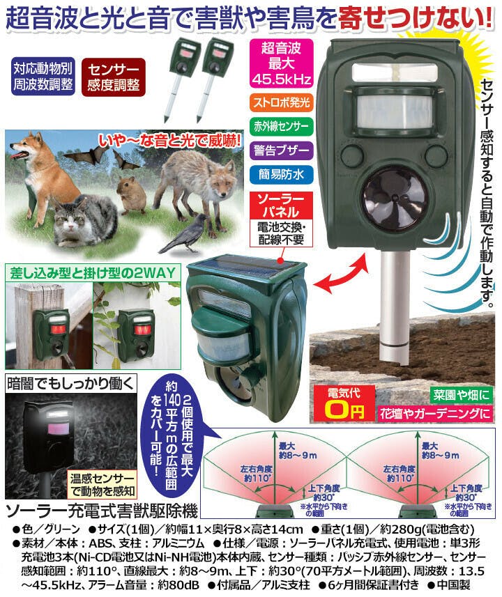 [仕様] ●電源:ソーラーパネル充電式 ●使用電池:単3形充電池3本(Ni-CD電池又はNi-NH電池)本体内蔵 ●センサー種類:パッシブ赤外線センサー ●センサー感知範囲:約110度、直線最大:約8~9m、上下:約30度(70平方メートル範囲) ●周波数:13.5~45.5kHz ●アラーム音量:約80dB [付属品] アルミ支柱 ●6ヶ月間保証書付き