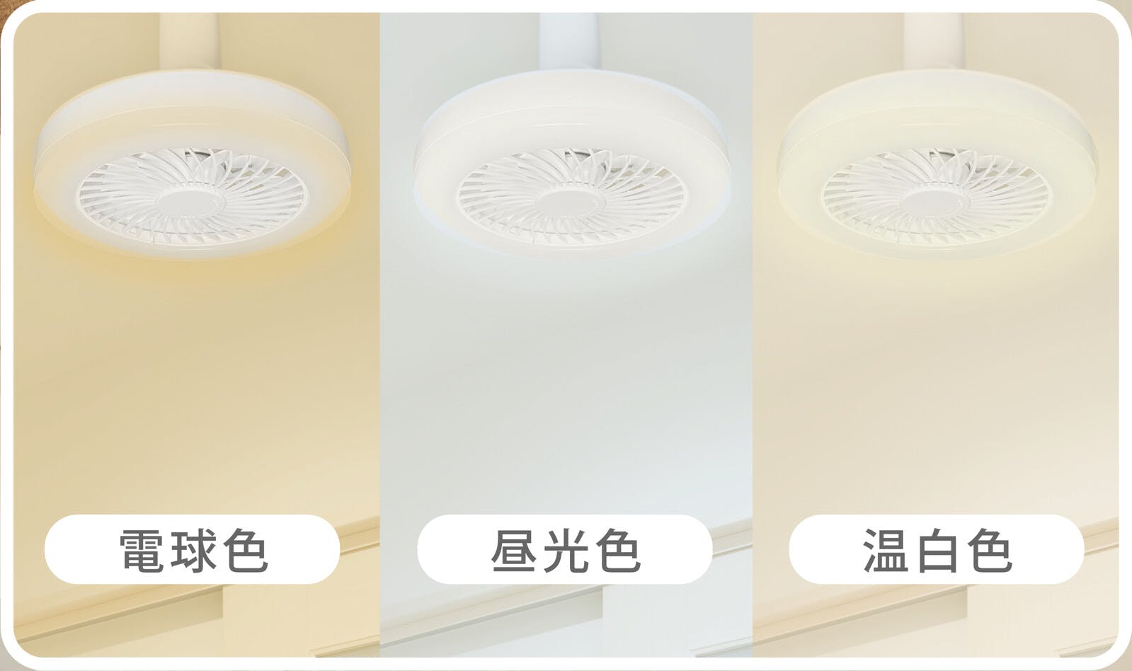 天井から快適な風と光を届けるファン一体型LEDライト ●空間を明るく照らしながら空気を循環!脱衣所・トイレなど空気がこもりやすく狭いスペースへの設置にピッタリです ●自宅の天井の金具にまわして取り付けるだけ ●洗面所・トイレ・クローゼット ●工事不要 ●風速切替3段階 ●明るさ調節3段階 ●3段階の調色機能付き:電球色、昼光色、温白色 ●一般的なサイズのE26口金に対応 ●ファンとライトは個別操作が可能! ●角度調整可能:垂直約300度、水平約300度