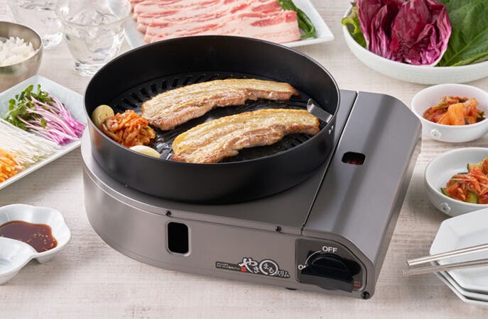 煙や油ハネを気にせず室内で手軽に焼肉 ●色/チャコールメタリック ●プレートの表面温度を約210~250度に保ち、煙の発生を抑制。更に高さ約4.7cmのガード付きでテーブルへの油ハネをガード。 ●直火のパワーでお肉がこんがり美味しく焼ける ●余分な油が溝に落ちヘルシー ●プレートはお手入れしやすいフッ素加工 ●簡単装着 ●トング:そのまま置いても先端がテーブルに触れず衛生的 [仕様] ●点火方式:圧電点火方式 ●容器着脱方式:マグネット方式