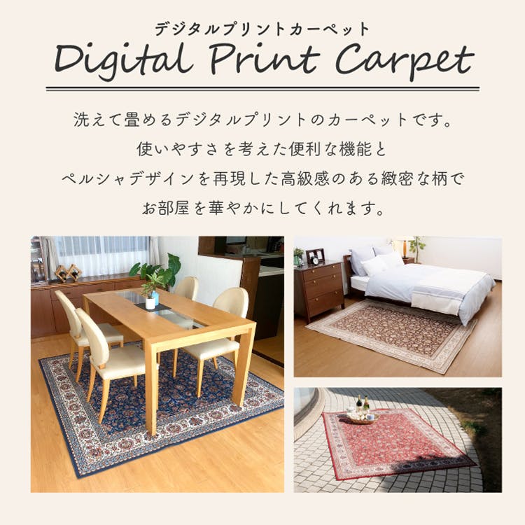 【洗える畳めるデジタルプリントのカーペット】です。使いやすさを考えた便利な機能とペルシャデザインを再現した高級感のある緻密な柄でお部屋を華やかにしてくれます。