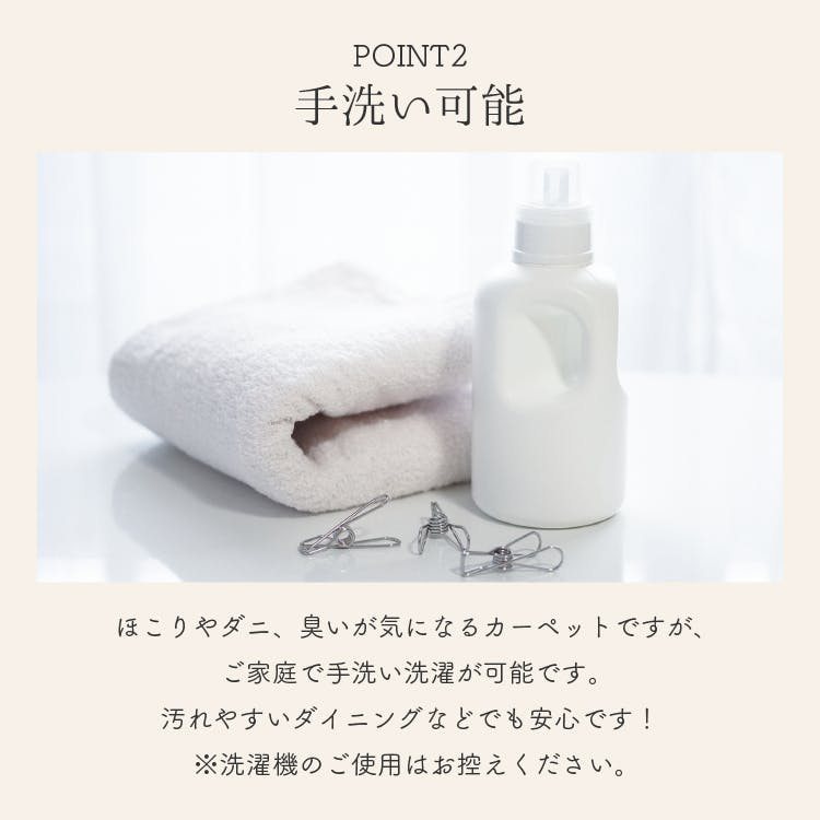 リビング、ダイニング、寝室、子供部屋、和室、ベランダまで様々な場所に使用できます。手洗いができるので、汚れやすい場所での使用やペットや小さいお子さんのいるお家でも安心してお使いいただけます。