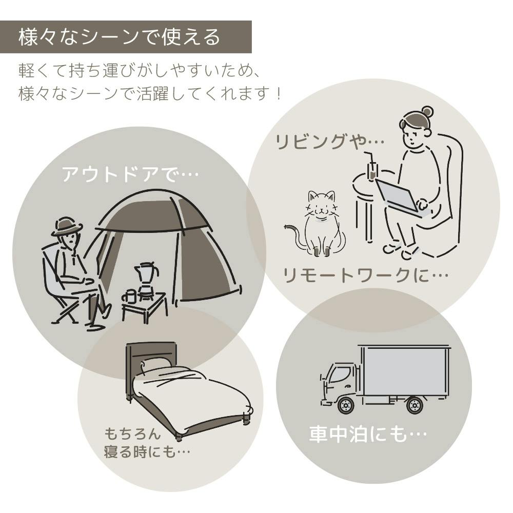【寝るときだけなんてもったいない、いつでもどこでも使える毛布】寝室やリビングはもちろん、たためば小さくコンパクトになる毛布なので持ち運びもしやすく、車やアウトドア、車中泊などにも最適です。1枚あればいろんなシーンで大活躍してくれる「使える」毛布です。 冬は毛布と掛け布団を組み合わせて、春先などは毛布1枚で、暑い季節はエアコン対策ブランケットに、1年中活躍してくれる毛布です。