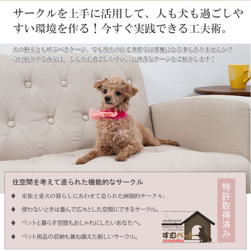 圧迫感がなく、シンプルに仕上げたお洒落なFACE/MARINE/CALMシリーズ。ワンタッチでたたんでしまえる収納型ケージ。インテリア性も兼ねたペット家具『すむぺっとシリーズ』。収納も付いたドッグサークルは、愛犬をサークルに入れるときだけ広げるので、普段は収納キャビネットのように使えるのが魅力!本体の奥行は約30cmでカウンター下や窓下に置いても邪魔にならないサイズ感が使いやすさの秘密です。