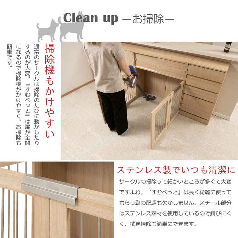 また、棚板を支えるダボにはネジ式ダボを採用。通常の差し込みのダボでは穴がきつく、一度はめると取れにくくなったり、スポッと取れて棚板が落ちる事が多々あります。ネジ式ダボはそんなストレスも解消!しっかり設置して位置変えも簡単です。長く暮らすからこそ使い易くお洒落なサークルが◎他のシリーズと合わせて、ダイニングやリビングなどでお洒落に収納できます。ケージ柵はステンレス製でお手入れもしやすい。開放感ある扉式でお掃除も楽々。