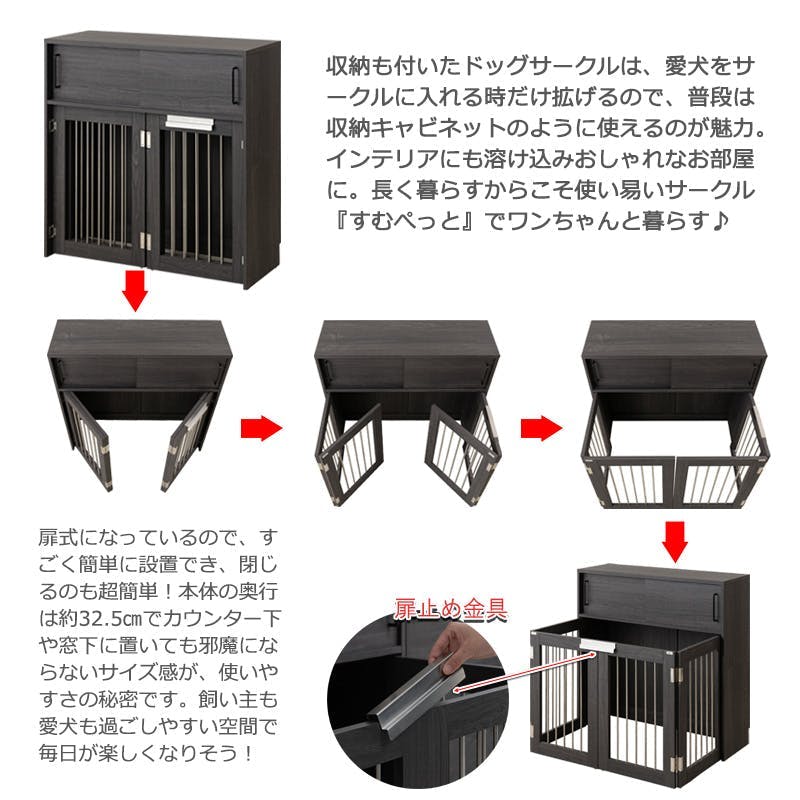 収納する物にこだわったカウンター下収納【Blacker】カウンター下収納シリーズ。ワンタッチでたたんでしまえる収納型ケージ。インテリア性も兼ねたペット家具『すむぺっとシリーズ』。収納も付いたドッグサークルは、愛犬をサークルに入れるときだけ広げるので、普段は収納キャビネットのように使えるのが魅力!本体の奥行は約32.5cmでカウンター下や窓下に置いても邪魔にならないサイズ感が使いやすさの秘密です。