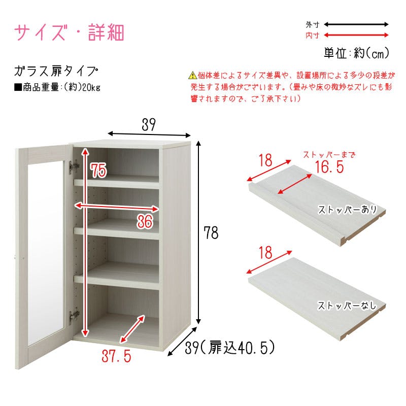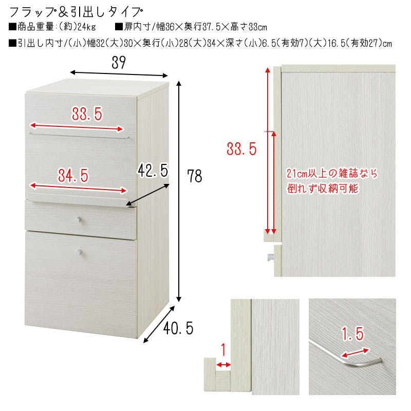 ■商品サイズ/本体:(約)幅39×奥行43×高さ78cm■扉内寸/(約)幅35.5×奥行37.5×高さ33cm■引出し内寸/(小)(約)幅32.5×奥行28×高さ6.5(有効7.5)cm、(大)(約)幅30×奥行34×高さ16.5(有効27)cm■棚板/可動式2枚(3.2cmピッチ6段階)■商品重量/(約)24kg■耐荷重量/棚板:(約)5kg■付属品/重ね時用連結金具・転倒防止金具■組立品