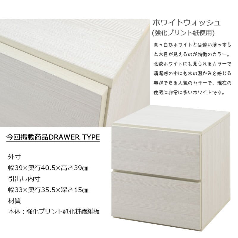 【WW】ダブルキューブボックス 引出タイプ ホワイトウォッシュ 白 木製 ストッパー付 引き出 ローチェスト 2段 レンジ台 収納ボックス A4 DVD ラック 台 収納ラック セラミック クローゼット上 下 幅39 キッチン