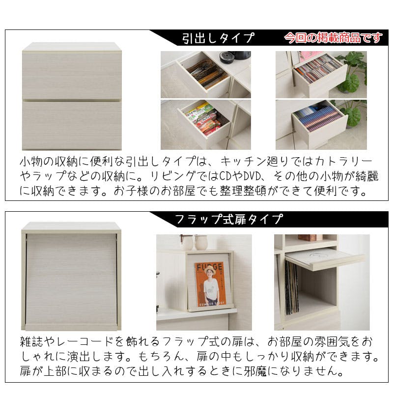階段状にしたり、アイランドカウンターのような間仕切りにしたり、壁面に積み上げたり、ロボードとしてもどんな姿にもなる。『使える』 をし っかりサポートした扉・引出し・オープン・レコ ードタイプとボックスデザインを損なわないキュ ーブ型に仕上げました。 スタッキングから並べたり、追加したりと様々な組み方ができるので、ライフスタイルの変化に合わせて組替えなど自在です。