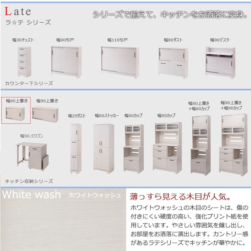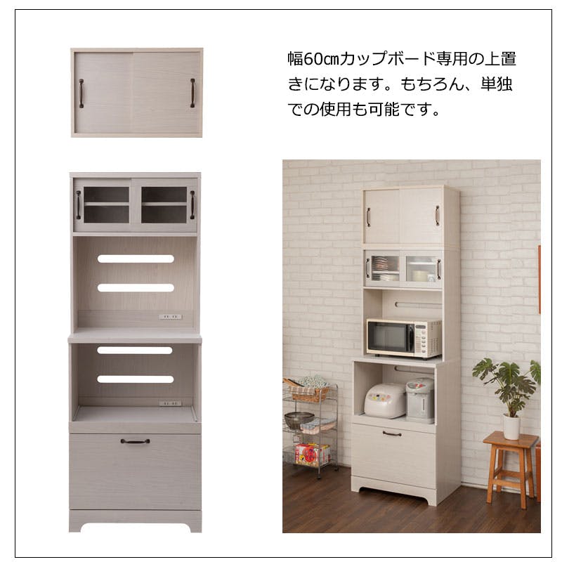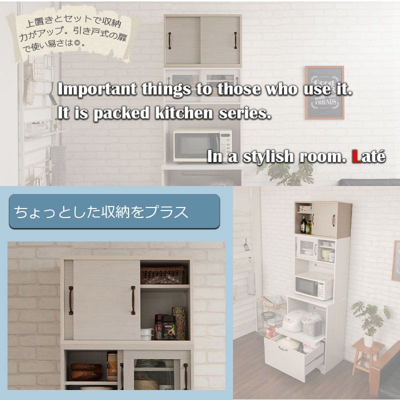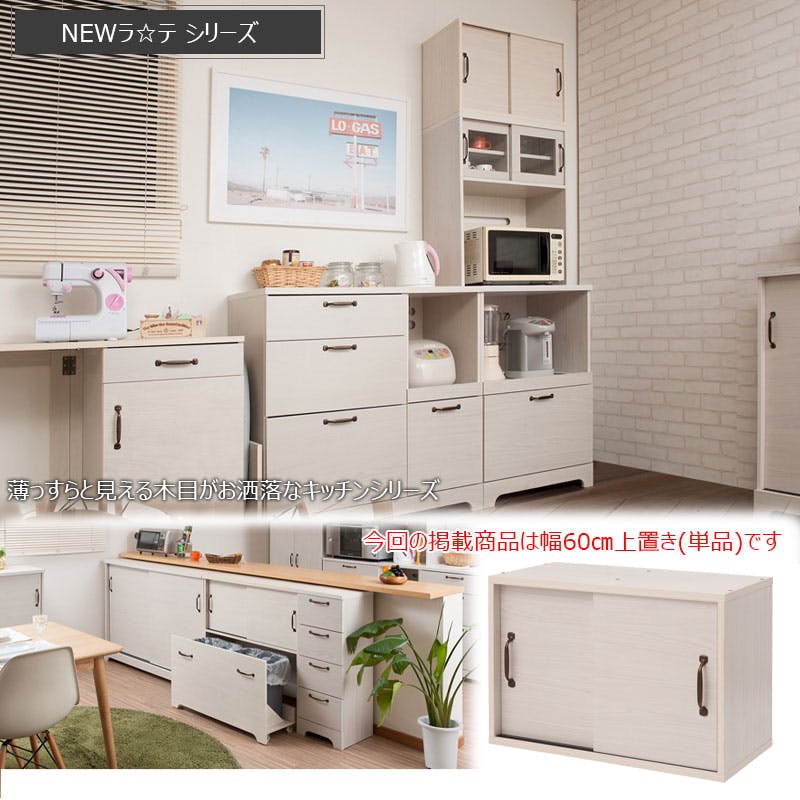 【Late】ラテシリーズ キッチンボード用上置き60幅 ホワイト色 可動棚 スライド棚 食器棚レンジラック キッチンボード収納 カップボード キッチン収納 北欧 ホワイト ラック棚 おしゃれ キッチンラック レンジボード シンプル カフェ風 木目 木製 フレンチカントリー