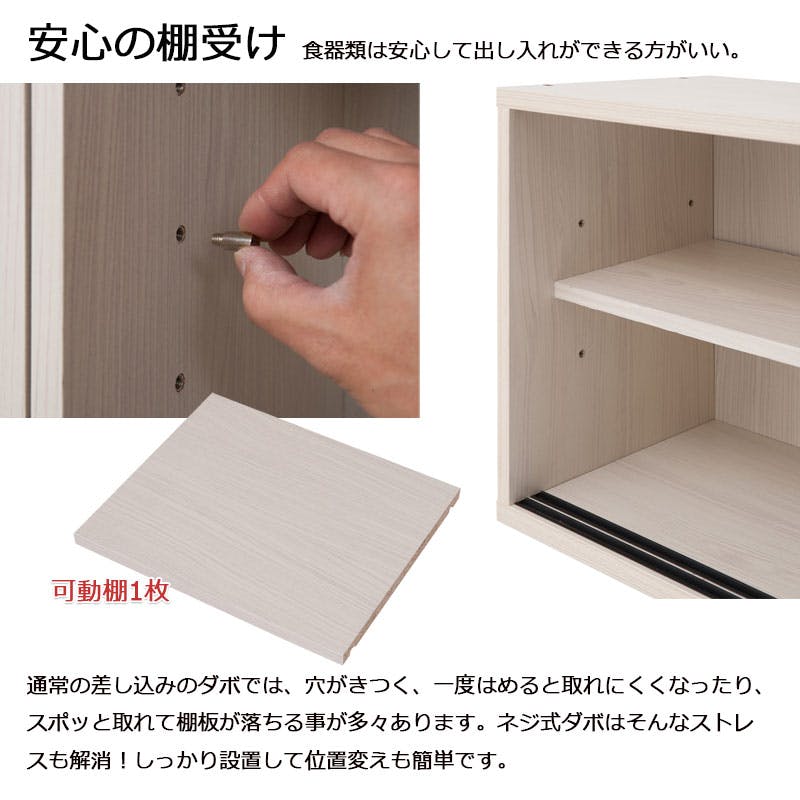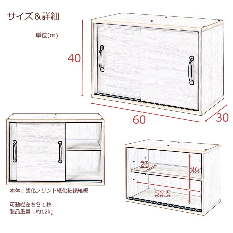■商品サイズ/本体:(約)幅60×奥行30×高さ40cm■引戸内寸/(約)幅56.5×奥行23×高さ36cm■棚板/可動式1枚(6.4cmピッチ・3段階)■付属品/連結部品(キッチンボードとセット時に使用)■耐荷重量/天板:(約)10kg、棚板:(約)5kg■商品重量/(約)12kg■お客様組立品