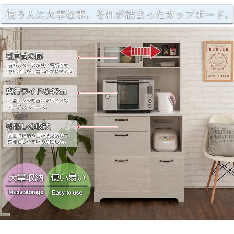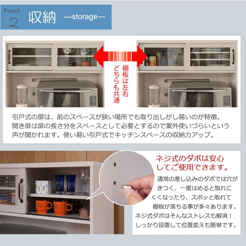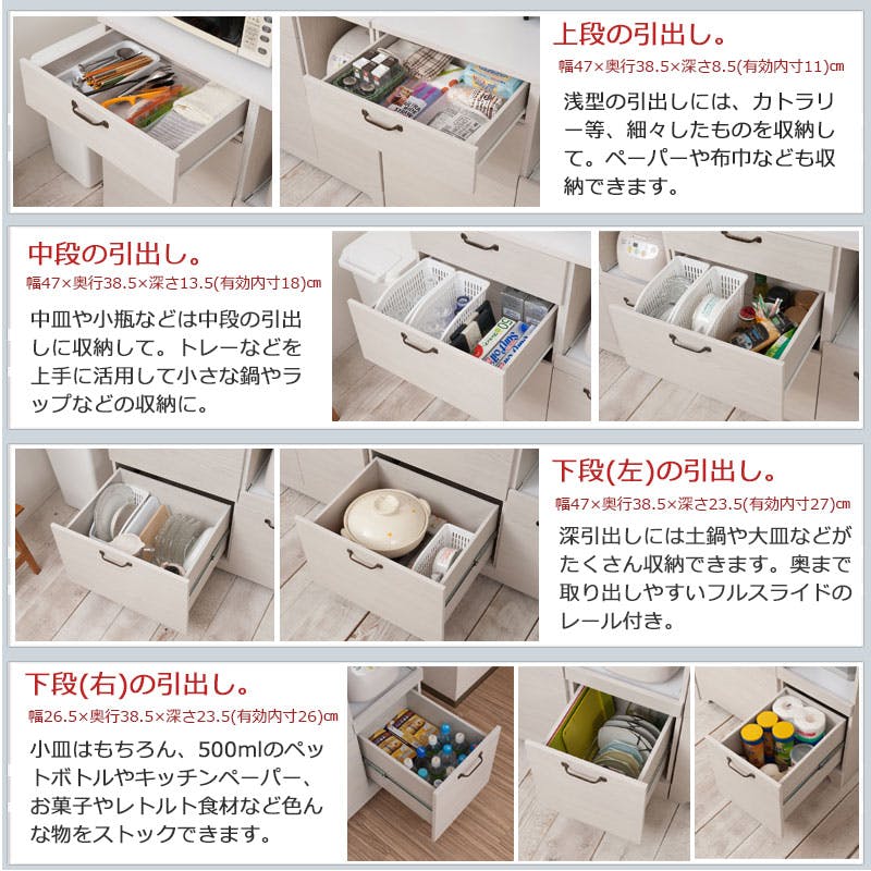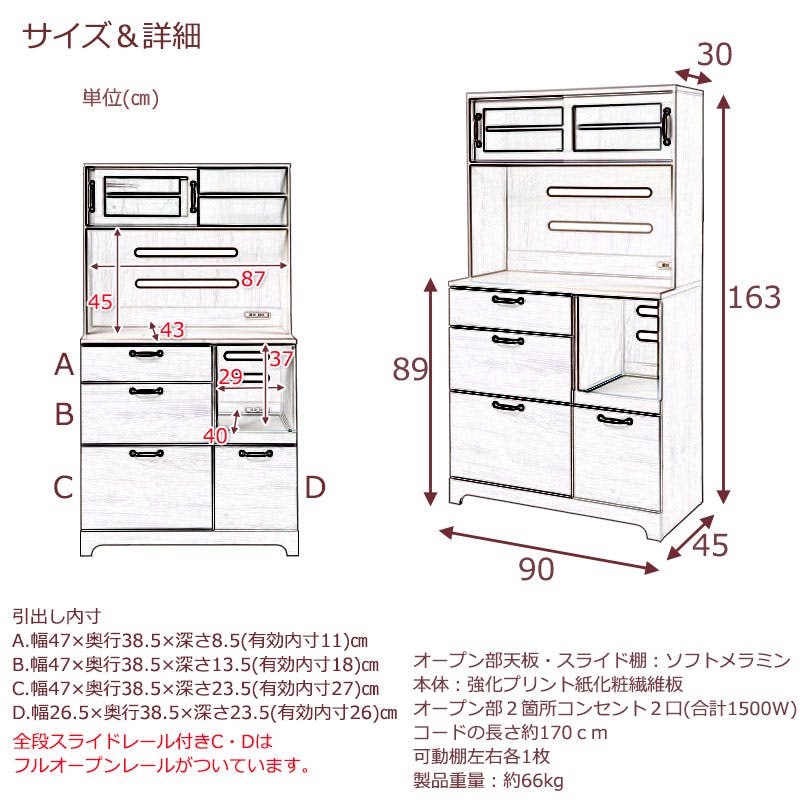 ■商品サイズ/■引戸内寸/(約)幅(左右共通)42.5×奥行23×高さ24.5cm■引出し内寸/(約)幅(左)47(右)26.5×奥行38.5×深さ(左上)8.5(有効11)、(左中)13.5(有効18)、(左下)23.5(有効27)、(右)23.5(有効26)cm■オープン部内寸/上部:(約)幅87×奥行43×高さ45cm、下部:(約)幅29×奥行40×高さ37cm■棚板/可動式2枚(3.2cmピッチ・3段階)■商品重量/(約)66kg■お客様組立品