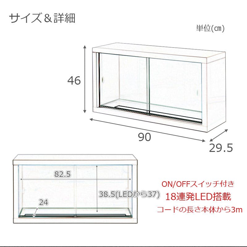 ■商品サイズ/本体:(約)幅90×奥行29.5×高さ46cm、内寸:(約)幅82.5×奥行24×高さ38.5(LEDライト除く37)cm■付属品/18連発LEDライト(AC100V 50/60Hz 3.6W)×1、連結金具×2■耐荷重量/天板:(約)20kg■商品重量/(約)20kg■お客様組立品