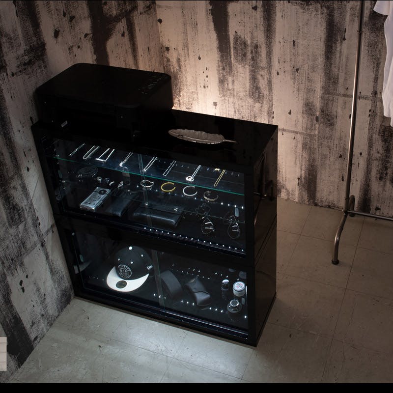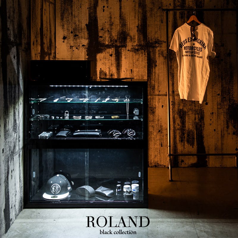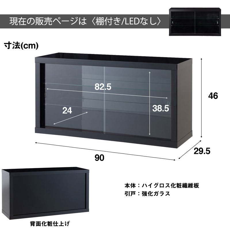 【ROLAND】しっかり守る頑丈設計 引戸ガラス扉付ユニットブラックコレクションボード 幅90 ガラス棚あり LEDライトなし ブラック色 黒 鏡面 光沢 ハイグロス 引き戸 フィギュア ケース ディスプレイ アクセサリーケース 飾り棚 スタッキング ディスプレイ ショーケース