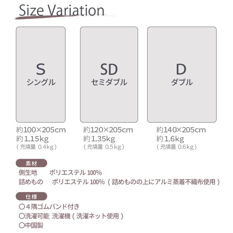 側生地/ポリエステル100% 詰め物/ポリエステル100%(詰め物の上にアルミ蒸着不織布使用)