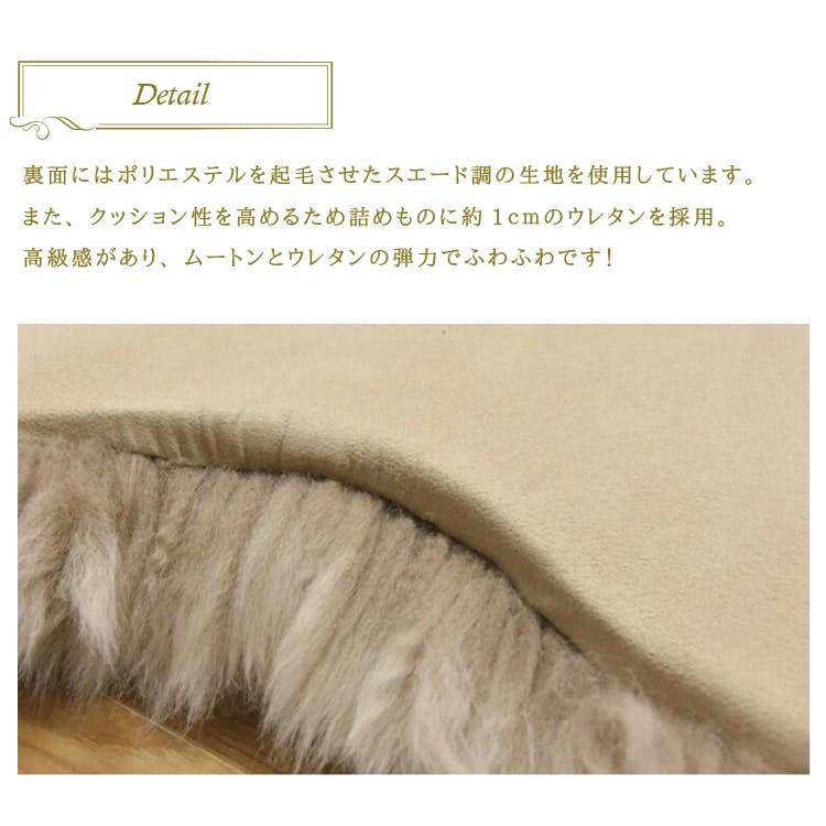 ●ふわふわの上質ムートンに包まれてぬくぬくおしゃれなお部屋に!●表地にふわふわのムートンを使用した贅沢なクッションです●裏地には、ポリエステルを起毛させたスエード調の生地を使用しています●クッション性を高めるために、約1cmのウレタンを入れています。ムートンの弾力とウレタンの弾力でふわふわです●使い方は色々。ダイニングキッチンの椅子や応接の椅子、事務所などの椅子の上にもお使いいただけます●その他、座布団代わりに、また車椅子やベビーカーのシートにもお使いいただけます