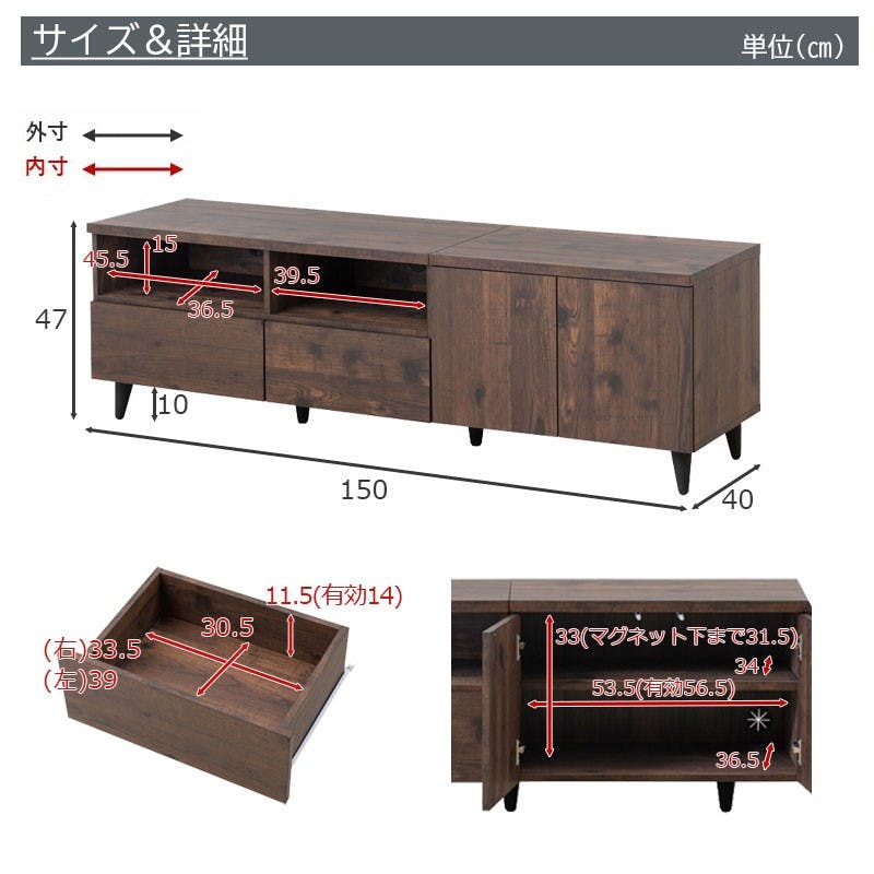 ■商品サイズ/本体:(約)幅150×奥行40×高さ47(脚部10含む)cm■オープン部内寸:(約)幅(大)45.5(小)39.5×奥行36.5×高さ15cm■引出し内寸/(約)幅(大)39(小)33.5×奥行30.5×深さ11.5(有効14)cm■扉内寸/(約)幅53.5(有効56.5)×奥行36.5(棚板34後部1cm配線用隙間あり)×高さ33(マグネット除く31.5)cm■商品重量/(約)34kg■お客様組立品