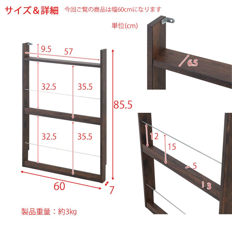 ■収納部内寸/(約)幅57×奥行(上)6.5(中・下)5×高さ(上)9.5(中・下)35.5cm■巾木よけ/(約)幅1×高さ10cm
