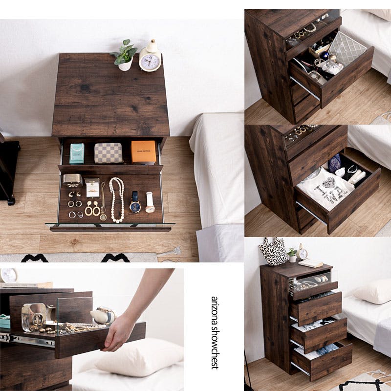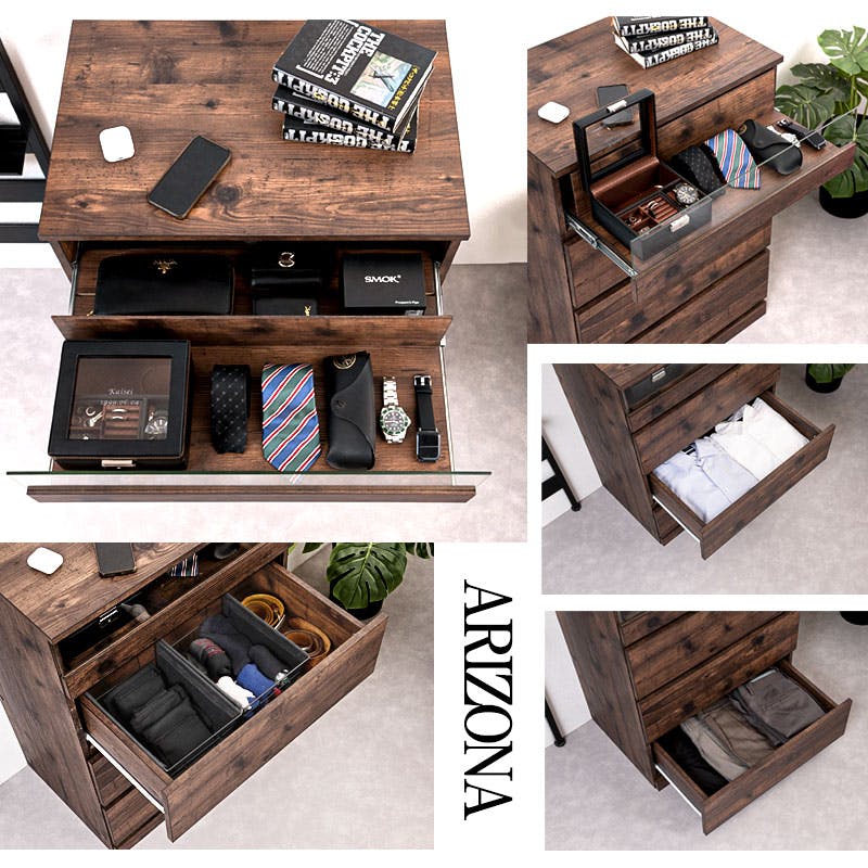 【ARIZONA】シークレット収納付き 全段スライドレール付き 幅45cmスリムチェスト ハイチェスト ローチェスト 引出し 引き出し ヴィンテージ ブラウン ガラスショーケース タンス 収納棚 ラック 木製 おしゃれ 衣類収納 箪笥 アクセサリー収納 A4収納 防犯 防犯グッズ